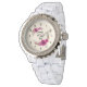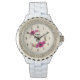A watch designed with pretty fuschia poppies and decorative sprigs and leaves in a circular floral wreath. Happy Mother's Day written inside in a cute trendy font. Pretty and elegant.
