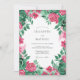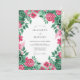 This design features a lush border of watercolor roses and foliage in shades of fuchsia and emerald green. The vibrant botanical elements create a romantic and lively mood for a summer event. Soft washes of pink accent the white background, highlighting the delicate leaves and full blooms.