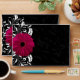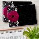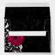 Cute and classy matching collection features black background with subtle swirling scrolls, and a vivid white swirl foreground design with bright pink fuchsia magenta gerbera gerber daisy flower. Perfectly elegant for a winter wedding, summer wedding or any season.