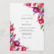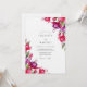 A vibrant watercolor design features fuchsia and magenta blooms with lush green foliage. The artistic floral arrangement creates a lively yet elegant mood for a special occasion.
