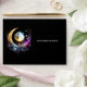 A beautiful white 3D looking full moon with ornate detail on it appears to be glowing brightly against a midnight black background. It is framed by a faux gold, magenta and blue crescent moon that has small twinkling stars around it and has a white template to the right of this generative content graphic. This chic and stylish illustration is ideal for a starry night quinceanera; a moon and stars special birthday party; a celestial engagement; an over the moon wedding; a gypsy fortune teller birthday theme party or wiccan upmarket event.