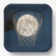 A full moon seems trapped in a basketball hoop, its netting stretched against a starry night sky, creating a surreal and captivating scene