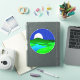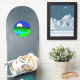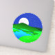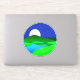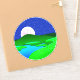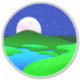 Sticker in circular illustration of a full moon rising over green hills by a lake shore, with a starry midnight blue sky