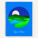 Journal in circular illustration of a full moon rising over green hills by a lake shore, with a starry midnight blue sky