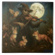 Spooky scene with a full moon shining down on a field of corn, A creepy scarecrow is playing the fiddle while some animals look on, Small creatures and an owl are part of this strange Halloween picture.
