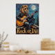 This dynamic artwork portrays a lion, looking effortlessly cool in sunglasses and a leather jacket, masterfully "shredding" an electric guitar while perched on a rustic rooftop. The scene unfolds under a prominent full moon in a textured night sky, with dark forest elements visible. The thick, expressive impasto creates a tangible texture, making the "Rock or Die" declaration resonate with the raw energy of the performance.