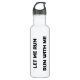A water bottle printed with the full text: "Let Me Run / Run With Me". The water bottle's size and colour are customisable!