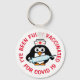 Fully vaccinated against covid coronavirus keychain. Custom round button key chain for vaccination ancouragement. Cute cartoon nurse penguin with big syringe shot. Add your own vaccine pandemic text optionally.