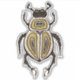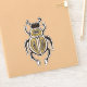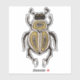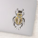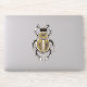 Entomology sticker with an ink illustration depicting a cartoon abstract beetle with decorative elements in white, gold and black over intense yellow background.