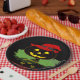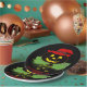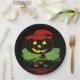 Delight your guests (and yourself) with these Halloween paper plates mostly in black, but with a lighted Jack O'Lantern and its reflection. A jaunty orange witchy-type hat tops the pumpkin, which is seated on a bed of green leaves. It's a handsome, very Halloweeny item suitable for your party or everyday enjoyment during the season.