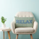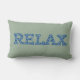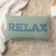 A fun lumbar pillow with the word 'CHILL' in letters filled with a blue and white pattern on a soft green background.