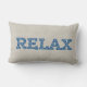 A fun lumbar pillow with the word 'RELAX' in letters filled with a blue and green floral pattern on a hessian-colored (burlap) background.
