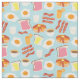 Breakfast staples like ham, orange juice, a sunny-side-up egg, toast, coffee, and bacon make up this delicious illustrated pattern.