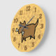 Cheerful and bright wall decor for a dog lover's home. Mellow orange colored dog wall clock with large 12 hour numbers. The clock is decorated with a cartoon of a dog carrying a bone with paw prints as a background. Great for adding a splash of color and joy to your home.