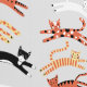 Lots of fun kitty cats leaping about on a pale neutral grey background. Original art by Nic Squirrell. Fresh and fun, perfect for a nursery or kid’s room, or for anywhere animal lovers go!