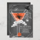 Fun halloween cocktail Party Invitation featuring a martini glass adorned with a black spider, spider webs, witch hat, jack o lantern pumpkin set on a contemporary black chalkboard background