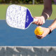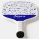 Stylish pickleball paddle design features fun pattern of handwritten chemistry study notes in blue on white background with customisable text to personalise with name or monogram. White handle and trim.