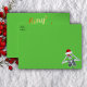 This envelope is green with a fun Christmas skeleton on the front in corner wearing a red Santa Hat holding up to shiny ornaments to his eyes. Merry Christmas text in bright gold is on the back flap and the inside is dark green with tiny gold flecks.
