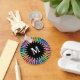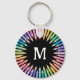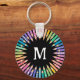 Colourful round keychain for a classroom personalised with the teacher's initial surrounded by coloured pencils in soft rainbow colours. Colourful monogrammed keychain for your art studio personalised with initial in white against a black background with a lot of coloured pencils all pointing towards the centre and sporting rainbow colours.