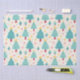 Fun colours decorate jolly little Christmas trees that parade over this light-hearted holiday tissue paper. A light teal blue green colours the festive trees amid fields of pink and yellow stars on an off-white background. This cute design is from a retro watercolor pattern.