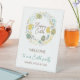 Celebrate Easter with a fun and festive egg hunt brunch! This Welcome to the party sign features a vibrant and colourful design that is sure to bring joy to your gathering. The background is a pastel robin egg blue-green, with a wreath made of cute chicks, eggs, and a variety of spring-themed accents. The text reads "Easter Brunch"; beneath it, you can customise or personalise the design with your family name and text.