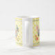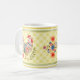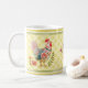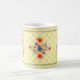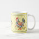 Bright yellow and green folk art style chickens mug with plaid background and floral centre.