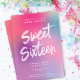 This modern Sweet Sixteen birthday party invite features a colourful gradient background in shades of pink, aqua, and purple with white brush script and modern typography. The brush script greeting says "Sweet Sixteen". You can also remove the gradient background and replace it with a solid colour of your choosing. You can even add a photo to the back! Just click on "customise design" in the personalisation drop-down menu.