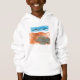 A fun and colourful watercolor pen and ink drawing of a sea turtle on the beach (and don't miss the pup in the surf!) graces the front of this comfy boy's hoodie.