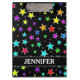 This fun, multicolored clipboard design features a pattern of star shapes of various sizes and coloured a variety of colours on a black background. It also features a personalised name.