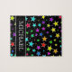 This fun, multicolored puzzle design features a pattern of star shapes of various sizes and coloured a variety of colours on a black background. It also features a custom name.