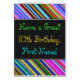 This fun, colourful and whimsical birthday-themed greeting card design features a warm birthday wish like "Have a Great 10th Birthday, First-Name!" on the front. The name on the front can be customised. There are also multicolored stripes at the top and bottom of the front. The inside features a birthday message that can be customised. A greeting card like this could be a fun way to deliver birthday wishes to somebody who is celebrating their tenth birthday. [~Z0000269]