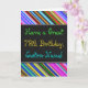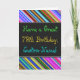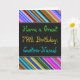This fun, colourful and whimsical birthday-themed greeting card design features a warm birthday wish like "Have a Great 78th Birthday, Custom-Name!" on the front. The name on the front can be personalised. There are also multicolored stripes at the top and bottom of the front. The inside features a customisable birthday message. A greeting card like this could be a fun way to deliver birthday wishes to somebody who is celebrating their seventy eighth birthday. [~Z0000269]
