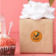 Fun stickers featuring a colourful original illustration of a witch flying past a full moon on a broom with a black cat and a Jack-o'-Lantern. Lots of Halloween party fun! Orange background.