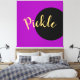 This fun template design features centred, festive, warm yellow script "Pickle" text against in front of a black centre circle and vibrant grape purple background. The text can be personalised.