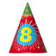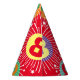 Fun custom kid's Birthday party paper cone hats. Cute design with personalised age number and fireworks and bright colours. Colours can be changed. Colourful design for children's celebration.