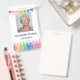 Vertical teacher ID badge personalised with photo, name, grade with coloured pencils in fun colours and a printed bunting flag banner in matching colours with patterned details, like stripes, dots, and stars. Colourful teacher ID badge with custom text and ID photo. Personalised kindergarten teacher ID with a fun design with coloured pencils in the colours of the rainbow.