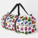 A cute illustrated marker art pattern of purses, bags, totes, jelly bags, knapsacks, nostalgia mini backpacks, handbags, messenger bags, sacks, designer fashion purse styles and more fun hand drawn illustration artsy design deluxe fun cute all-over style duffel bag. Get an epic cartoon style dufflebag today.