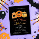 This cute Halloween party invitation features a black background, adorable pumpkin illustrations, and fun typography on the front. On the back you will find an orange and black stripe background. Further customise this design by adding a photo and/or additional text to the back!