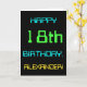 This simple and fun birthday greeting card design features a message like "HAPPY 18th BIRTHDAY, ALEXANDER!". It also features a fun look inspired by digital computing. The name on the front and the message on the inside can be personalised. It could be sent or given to somebody who is celebrating their eighteenth birthday, and who perhaps works as a computer programmer, a software developer, a database administrator, a network administrator, an electronics engineer, or who otherwise enjoys using computers. [~Z0000100]