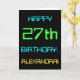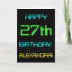 This simple and fun birthday greeting card design features a message like "HAPPY 27th BIRTHDAY, ALEXANDRA!". Its look is inspired by the field of digital computing. The name on the front and the message on the inside can be personalised. It could be sent or given to somebody who is celebrating their twenty seventh birthday, and who perhaps works (or worked prior to retirement) as a database administrator, a computer programmer, a network administrator, a software developer, an electrical engineer, or who otherwise enjoys using computers. [~Z0000100]