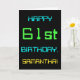 This simple and fun birthday greeting card design features a message like "HAPPY 61st BIRTHDAY, SAMANTHA!". Its look is inspired by the field of digital computing. The name on the front and the message on the inside can be customized. It could be sent or given to somebody who is celebrating their sixty first birthday, and who perhaps works (or worked prior to retirement) as a computer programmer, a software developer, a database administrator, a network administrator, an electronics engineer, or who otherwise enjoys using computers. [~Z0000100]