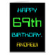 This simple and fun birthday greeting card design features a message like "HAPPY 69th BIRTHDAY, ANDREW!". It also features a fun appearance inspired by digital computing. The name on the front and the message on the inside can be customised. It could be sent or given to somebody who is celebrating their sixty ninth birthday, and who perhaps works (or worked prior to retirement) as a database administrator, a computer programmer, a network administrator, a software developer, an electrical engineer, or who otherwise enjoys using computers. [~Z0000100]