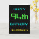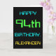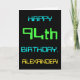 This simple and fun birthday greeting card design features a message like "HAPPY 94th BIRTHDAY, ALEXANDER!". Its look is inspired by the field of digital computing. The name on the front and the message on the inside can be customised. It could be sent or given to somebody who is celebrating their ninety fourth birthday, and who perhaps works (or worked prior to retirement) as a computer programmer, a software developer, a database administrator, a network administrator, an electronics engineer, or who otherwise enjoys using computers. [~Z0000100]