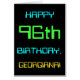 This simple and fun birthday greeting card design features a message like "HAPPY 96th BIRTHDAY, GEORGIANA!". Its appearance is inspired by the field of digital computing. The name on the front and the message on the inside can be customised. It could be sent or given to somebody who is celebrating their ninety sixth birthday, and who perhaps works (or worked prior to retirement) as a database administrator, a computer programmer, a network administrator, a software developer, an electrical engineer, or who otherwise enjoys using computers. [~Z0000100]