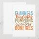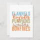 This vibrant and textured fall design highlights the quintessential elements of the autumn season with the words "Flannels," "Hayrides," "Pumpkins," "Sweaters," and "Bonfires." Each word is displayed in bold, uppercase letters, with a weathered texture that gives the design a rustic, vintage feel. The colour palette includes cool blues, warm oranges, earthy greens, and soft browns, capturing the diverse colours of fall. The words "hayrides" and "sweaters" are written in a flowing, cursive script that contrasts beautifully with the blocky text, adding a touch of elegance and movement to the design. Tiny star accents are scattered around the text, adding an extra layer of charm and playfulness.