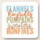 This vibrant and textured fall design highlights the quintessential elements of the autumn season with the words "Flannels," "Hayrides," "Pumpkins," "Sweaters," and "Bonfires." Each word is displayed in bold, uppercase letters, with a weathered texture that gives the design a rustic, vintage feel. The colour palette includes cool blues, warm oranges, earthy greens, and soft browns, capturing the diverse colours of fall. The words "hayrides" and "sweaters" are written in a flowing, cursive script that contrasts beautifully with the blocky text, adding a touch of elegance and movement to the design. Tiny star accents are scattered around the text, adding an extra layer of charm and playfulness.