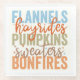This vibrant and textured fall design highlights the quintessential elements of the autumn season with the words "Flannels," "Hayrides," "Pumpkins," "Sweaters," and "Bonfires." Each word is displayed in bold, uppercase letters, with a weathered texture that gives the design a rustic, vintage feel. The colour palette includes cool blues, warm oranges, earthy greens, and soft browns, capturing the diverse colours of fall. The words "hayrides" and "sweaters" are written in a flowing, cursive script that contrasts beautifully with the blocky text, adding a touch of elegance and movement to the design. Tiny star accents are scattered around the text, adding an extra layer of charm and playfulness.