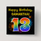 This fun, vibrant button design features a colourful bursting celebratory fireworks inspired pattern, along with the number "13" having a multicolored rainbow like spectrum or gradient pattern. It also features a personalised name and event message, such as a "Happy Birthday" birthday greeting. A button like this might be worn by the guests at a birthday party being held to celebrate somebody’s thirteenth birthday. [~Z0000334]