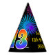 This fun, vibrant birthday party hat design features a colourful pattern inspired by bursting celebratory fireworks, along with the number "13" having a multicolored rainbow inspired spectrum or gradient pattern. It also features a personalised name and event message, such as a "Happy Birthday" birthday greeting. A birthday-themed paper hat like this might be worn by the attendees at a birthday party being held to celebrate somebody’s thirteenth birthday. [~Z0000333]