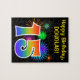 This fun, vibrant puzzle design features a colourful pattern inspired by celebratory fireworks, along with the number "15" featuring a multicolored rainbow inspired gradient pattern, on a black coloured background. It also features a customisable name and event message, such as a birthday greeting. A puzzle like this might be a fun way to send a birthday message to acknowledge somebody’s fifteenth birthday. [~Z0000329]